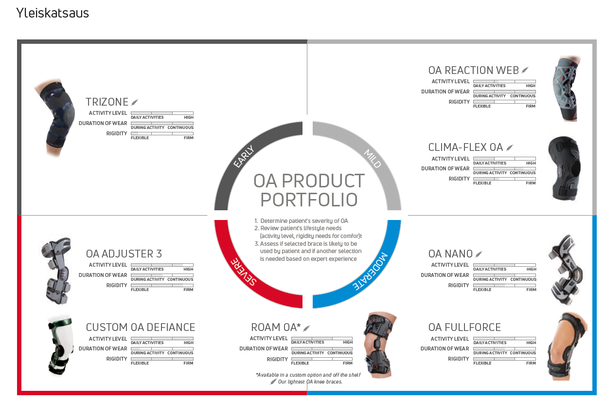 Useat tutkimukset (3,4) osoittavat, että polvituet voivat lievittää sekä kipua että jäykkyyttä polven nivelrikossa (OA mediaalisessa nivelosastossa).